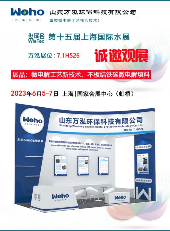 我公司將于2023年6月5-7日參加第十五屆上海國際水展,此次世環(huán)會水展在上海國家會展中心(虹橋)舉辦,萬泓展位號:7.1H526。萬泓此次展出微電解工藝新技術(shù)、新型真正不板結(jié)鐵碳填料,以解決困擾環(huán)保領(lǐng)域多年的鐵碳填料易板結(jié)難題。誠邀新老客戶蒞臨指導(dǎo)!