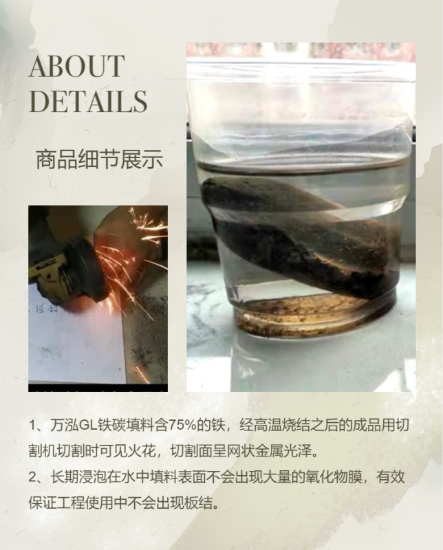 微電解填料又稱鐵碳填料,內(nèi)電解填料,是微電解技術處理各類高濃度有機廢水的主要材料。萬泓新型GL微電解填料經(jīng)多年實驗改良配方,由鐵、碳、多種催化劑、活化劑充分混合,采用高溫燒結技術,解決了長久以來市場上填料板結的問題。該填料環(huán)境適應性強,在廢水水質(zhì)情況有波動的情況下,仍然可以正常運行,有效去除COD、色度,提高可生化性,處理效果持續(xù)穩(wěn)定不板結!